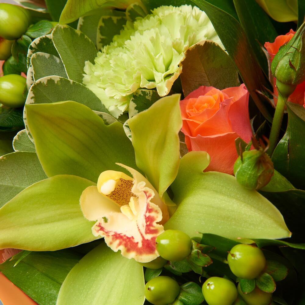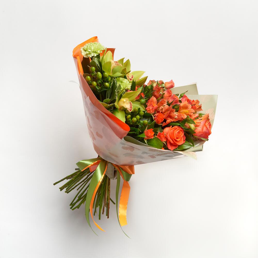 Контрастный букет из роз, орхидей, альстромерий, диантусов и зелени. Этот яркий букет несомненно удивит ваших близких своим оригинальным сочетание цветов.